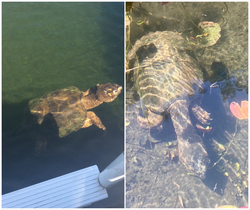The bass share the bay with Snappy, our majestic snapping turtle who loves to flash us his shell! These prehistoric looking omnivores are the largest freshwater turtle in Canada and their shell can grow to a size of 47 cm, or 18”. I have no idea how old Snappy is but he’s been this size since we first arrived here 25 years ago and they can reach upwards of 70 years in age. Snappy loves seeing the Georgian Pearl come in to the dock as the small crumbs and tidbits that get washed down our sink and into the water become his evening appetizer! He is a gentle giant and I have no worries swimming when he’s floating about, but they can be dangerous when encountered on land.