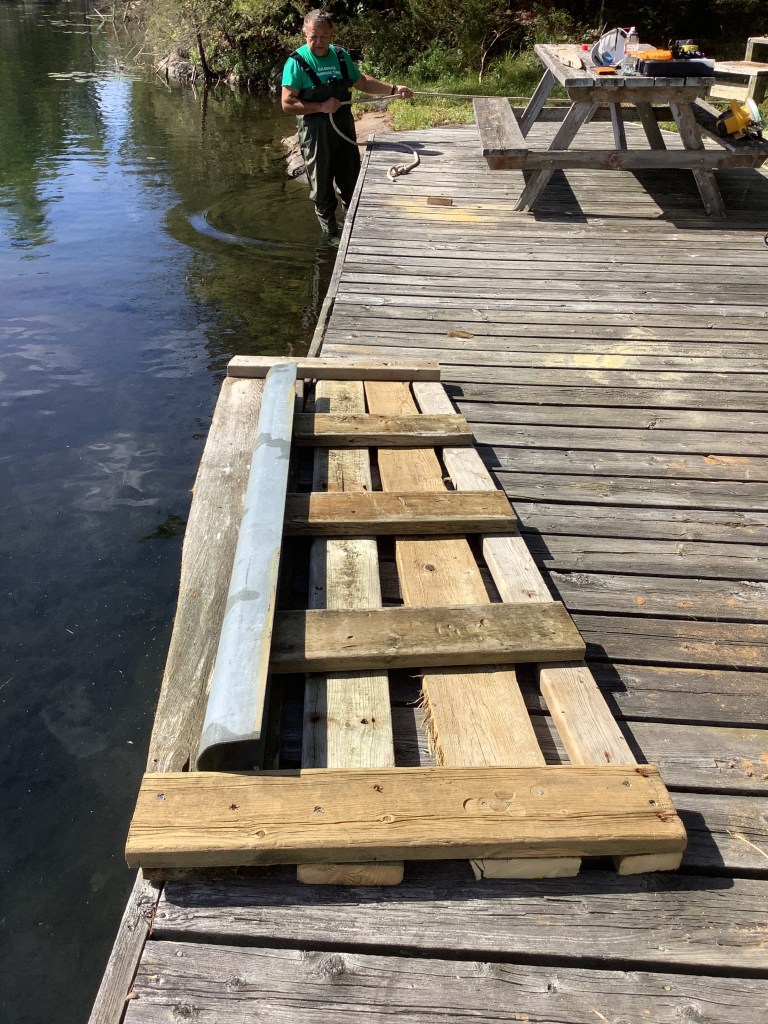 And so enough with the bullying, we humans retaliated by building our own version of a dam which we nailed to the beaver chewed holes in the side of our dock this fall, not sure if they were inside or not but they have disappeared…for now anyways!