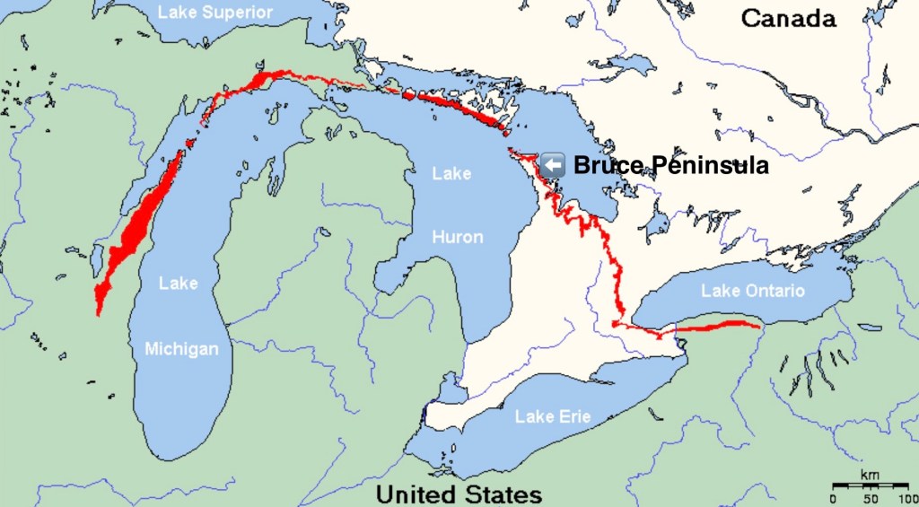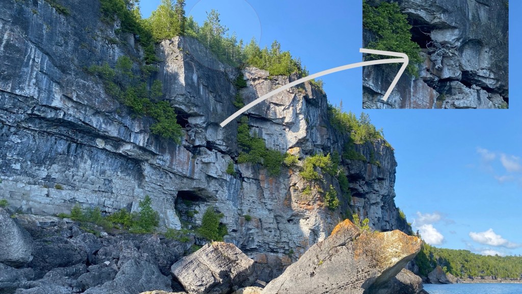 A brief history of this area: the Niagara escarpment was formed over 450 million years ago and stretches from the Niagara River up to Tobermory, on to Manitoulin Island and over to Michigan. The Bruce Peninsula portion as seen from the water of Georgian Bay is incredible! The high escarpment cliffs along the north and east sides of the peninsula are composed of dolomite rock, a type of soft limestone very susceptible to erosion, thus creating the amazing shoreline with it’s multiple caves, flowerpots, overhangs and cliffs.