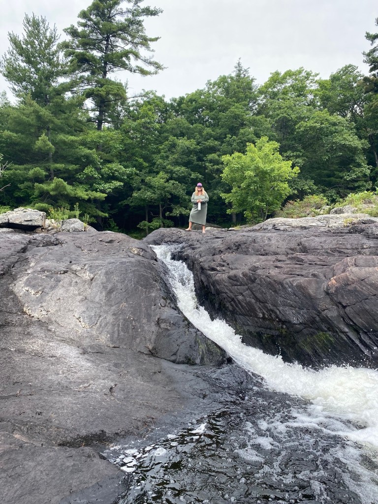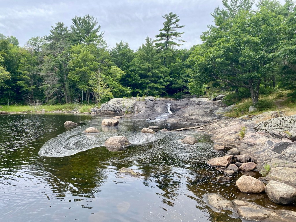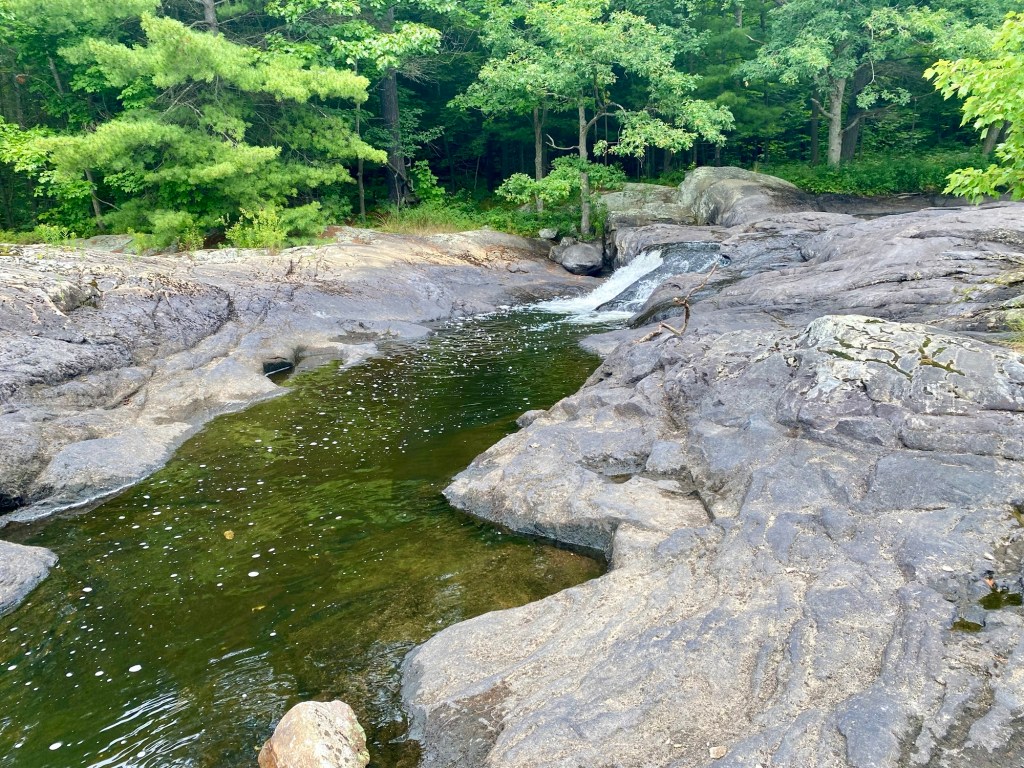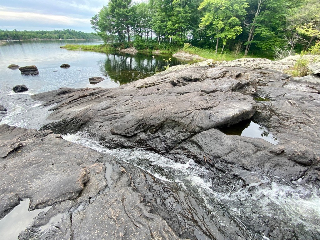 Walk alongside the chute and follow the water as it winds over the dark gneiss, carving multiple paths through the ancient rock. At the top is a good view of the river which flows from Little Blackstone Lake – a fairly easy portage should you wish to bring an inflatable kayak.