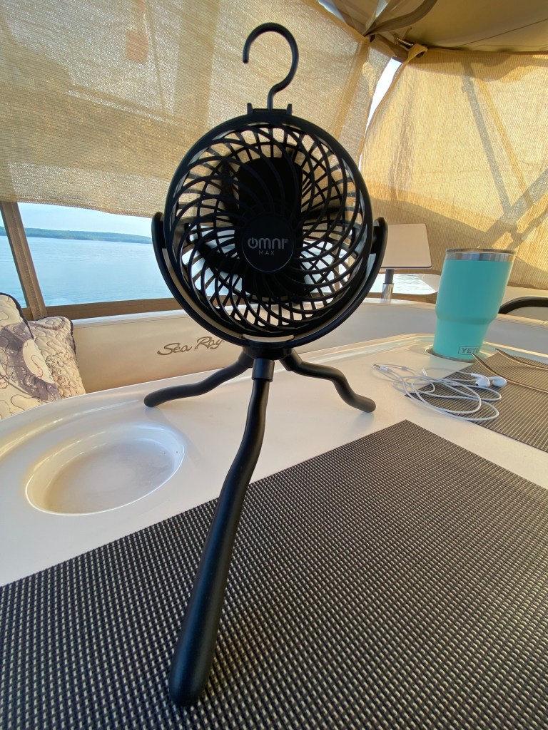 1. Omni Max USB Rechargeable fan from Home Hardware $30 (in 2024): this was a winner, especially for the bedroom when those hot summer nights set in! With 3 speeds, bendable legs and a hook, this fan is easily positioned anywhere and when charged will run on low for about 16 hours, and quietly! We keep one on the bridge and one in the cabin. Added bonus: on high it keeps those pesky ankle biters away during the day!