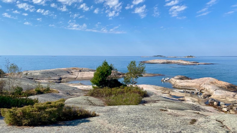A beautiful island with stunning 360 degree views of Georgian Bay, the expansive flat bedrock top is easy to walk while the gently sloping sides provide wind protection for picnics and afternoon naps.